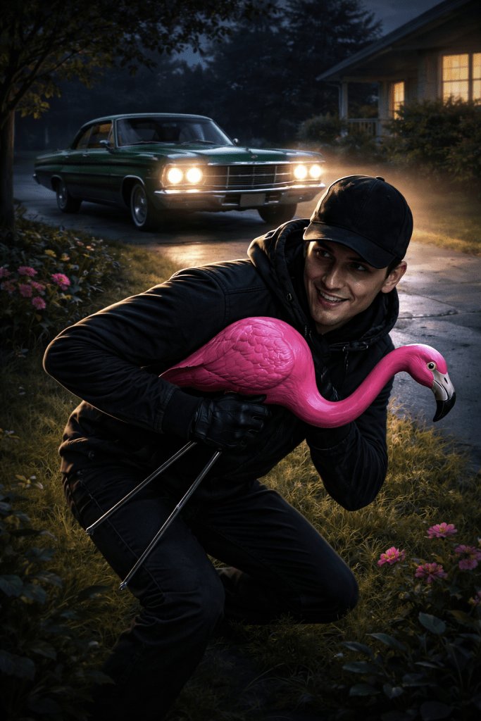 As boredom reached its peak we come around a corner, and one of the guys had someones lawn decoration catch his eye. Not just any lawn ornament either – it was a plastic pink flamingo. You’ve all seen them I’m sure. The long-legged lawn chickens dressed up for a tropical vacation that people seem to love. “Hayden” (note, names have been changed – if the people in this story wish to out themselves that will be on them) – said “stop the car!!” and quickly jumped out, crouching low and moving like a ninja across the lawn. Looking around furtively he quickly scooped up the poor flamingo and bolted back to the car yelling “GO GO GO!!”